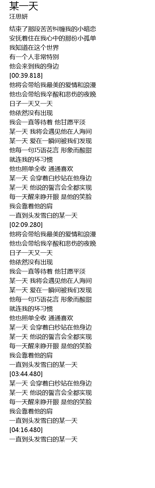 | [01:38.490] | 某一天 会穿着白纱站在他身边 |