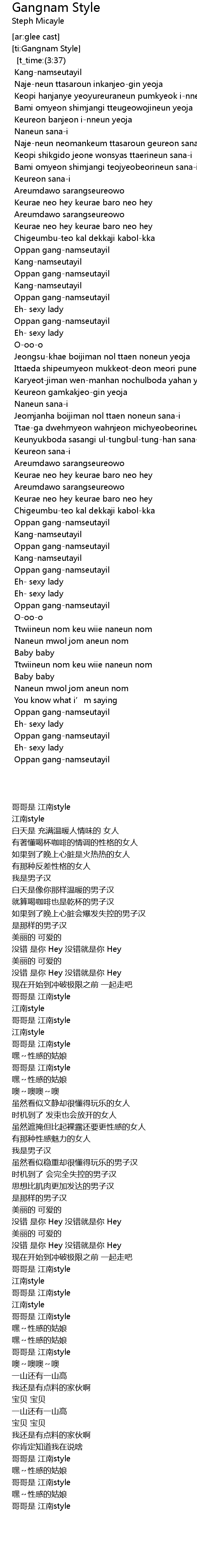 | [00:04.378] [t_time:(3:37)] | Oppan gangnamseutayil |
