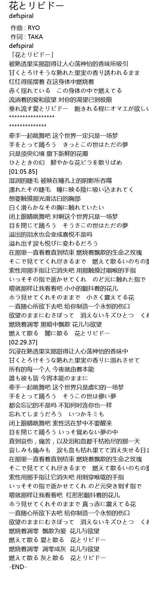 | [02:19.29] | 燃烧着凋零 黑暗中飘散 花儿与欲望 |