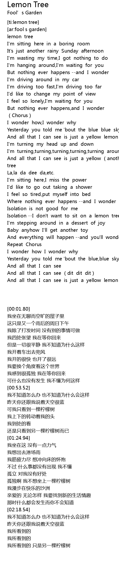| [01:14.27] | And all that I can see is just a yellow (another)lemon tree |