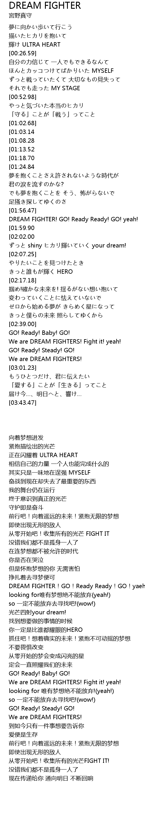 | [01:56.75] | DREAM FIGHTER!GO!Ready Ready!GO!yaeh! |