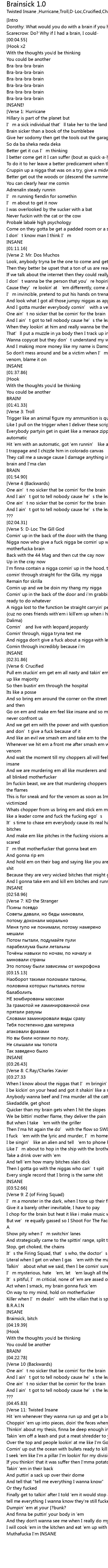 | [04:51.56] | Takin ' em off a leash and put a meat shredder to you fucking poodles |