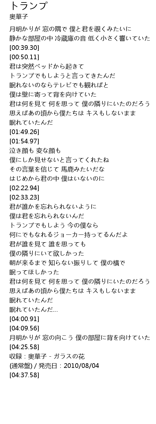 | [04:27.58] | 収録:奥華子 - ガラスの花 (通常盤)/発売日:2010/08/04 |