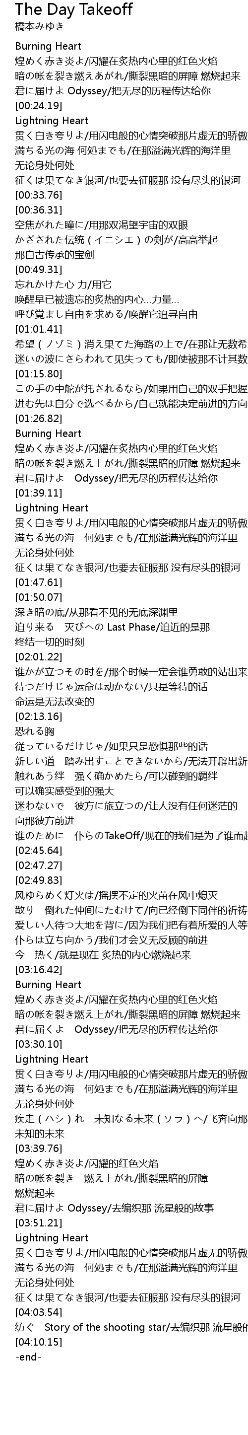 | [03:18.39] | Burning Heart 煌めく赤き炎よ/闪耀在炙热内心里的红色火焰 |