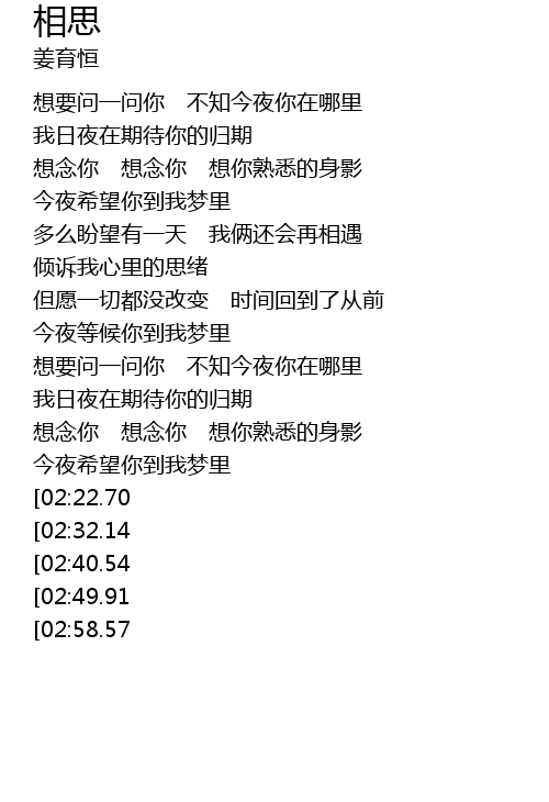 | [03:34.72][02:22.70] | duō me pàn wàng yǒu yì tiān wǒ liǎ hái huì zài xiāng yù |
