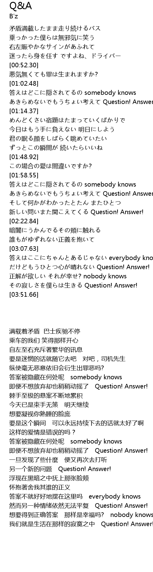 | [03:34.59] | 然而另一种情绪依然无法平复 Question! Answer! |