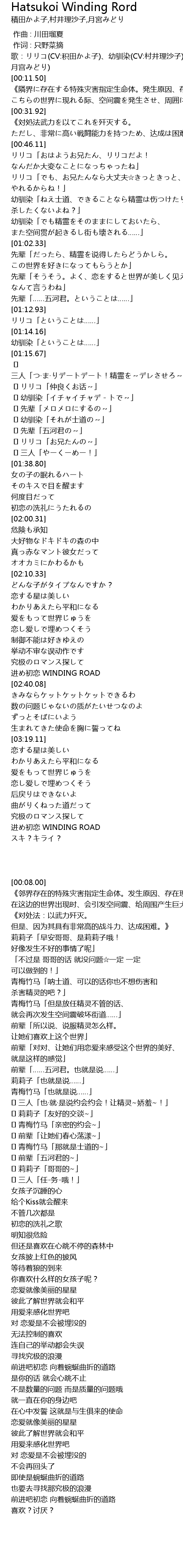 | [00:08.00] | 歌:リリコ(CV:积田かよ子)、幼驯染(CV:村井理沙子)、先辈(CV: 月宫みどり) |