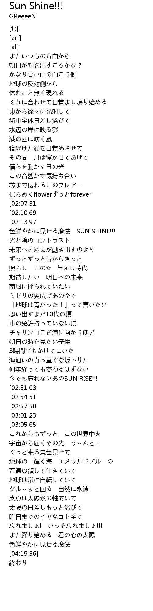 | [04:14.52][03:01.23] | 希望持たせてくれるだろう SUN SHINE!!! |