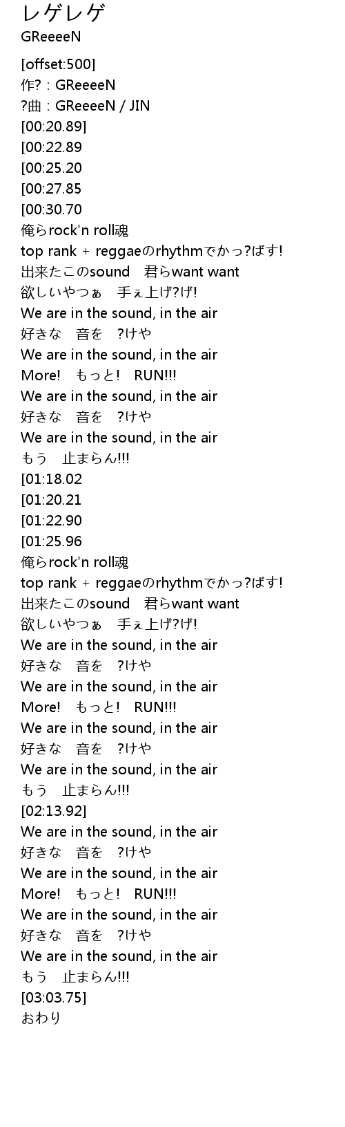 | [00:34.42][00:22.89] | レゲレゲsound Rescue me |