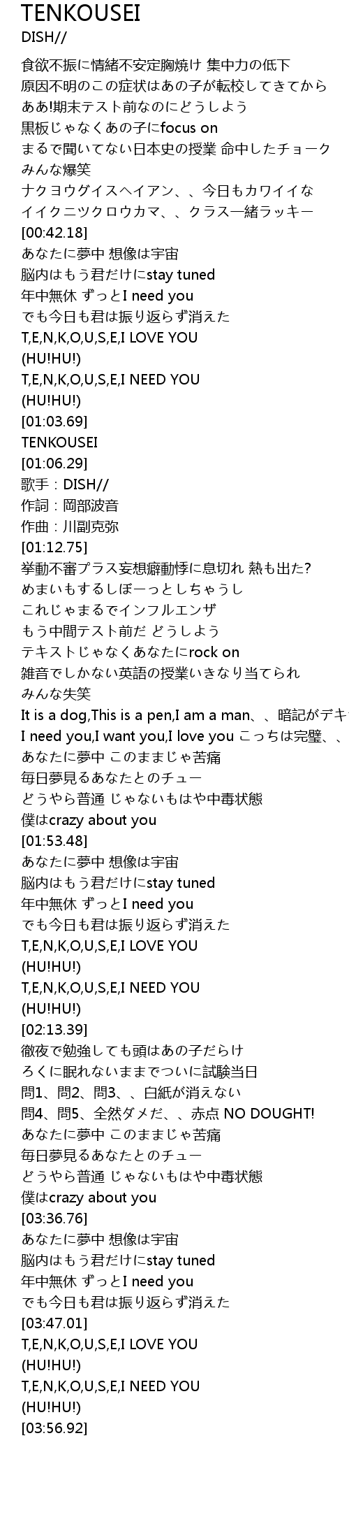 | [00:57.32] | T, E, N, K, O, U, S, E, I NEED YOU |