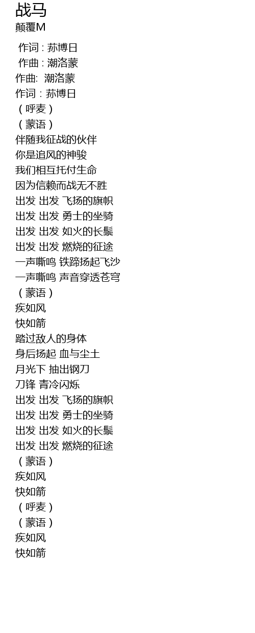 | [02:33.19] | 出发 出发 如火的长鬃 |