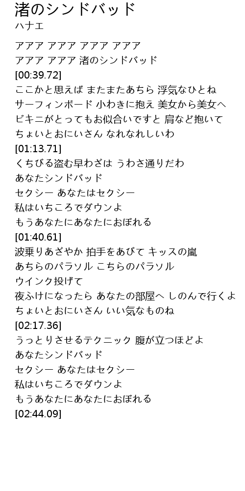 | [00:33.79] | アアア アアア 渚のシンドバッド |