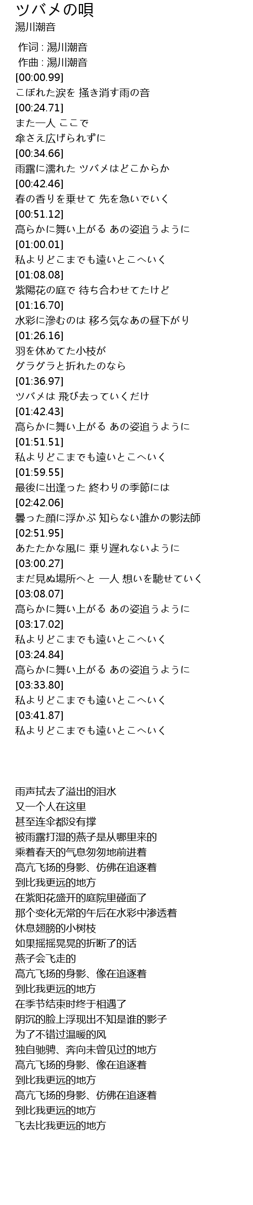 | [00:35.71] | 雨露に濡れた ツバメはどこからか |