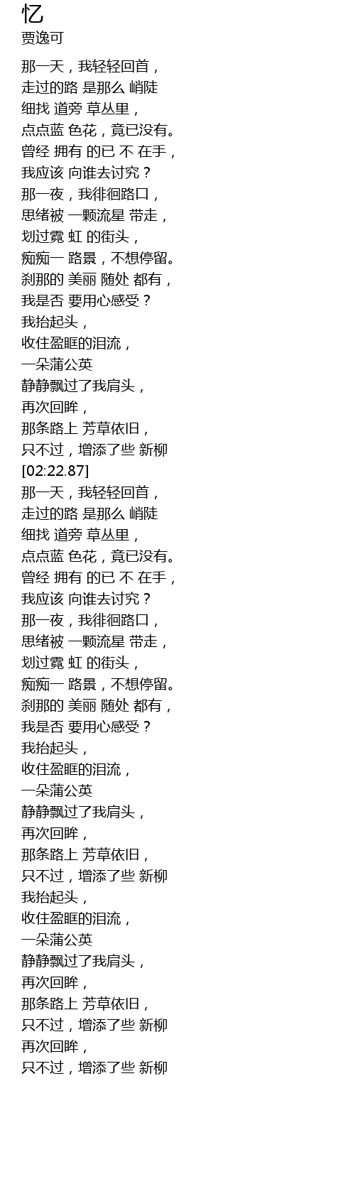 | [05:02.24] | 那条路上 芳草依旧, |