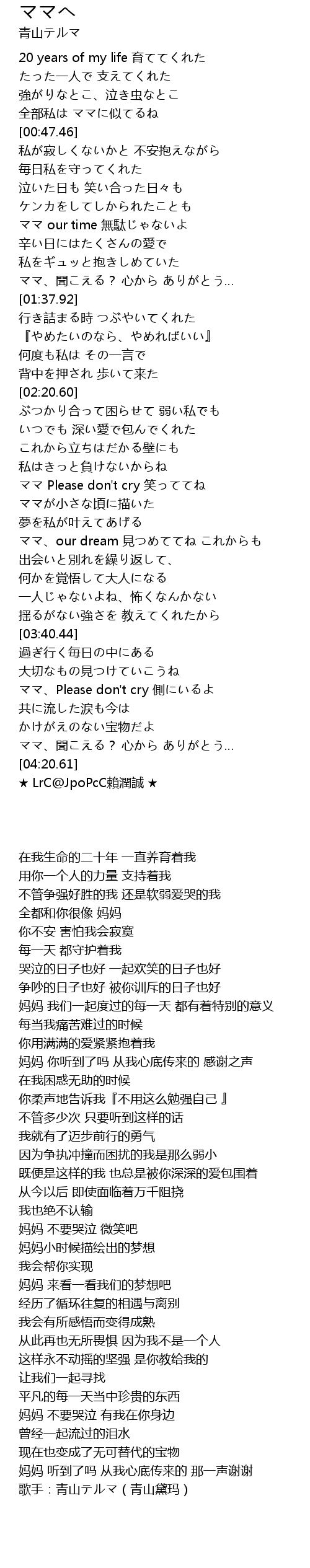 | [02:44.63] | ママ Please don't cry 笑っててね |