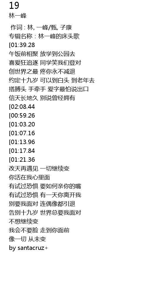 | [00:29.31] | 约定十九岁 可以到白头 到老年去 |