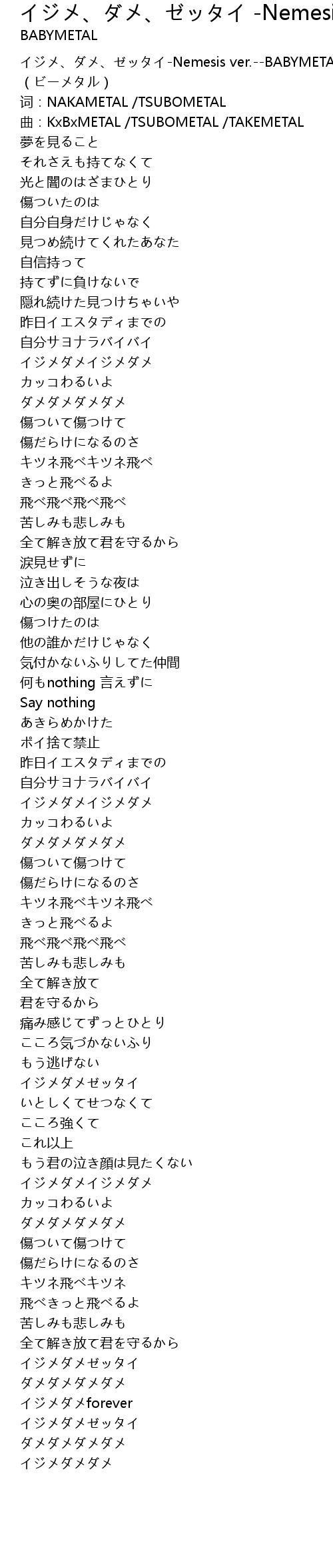 | [00:00.00] | イジメ、ダメ、ゼッタイ-Nemesis ver.--BABYMETAL (ビーメタル) |