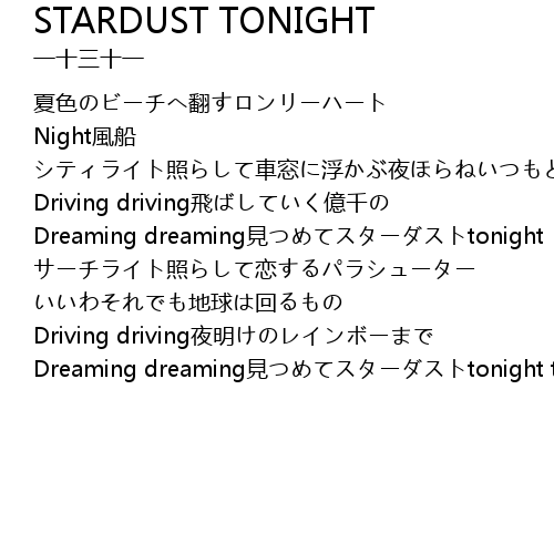 | [02:38.395] | Dreaming dreaming見つめてスターダストtonight tonight |