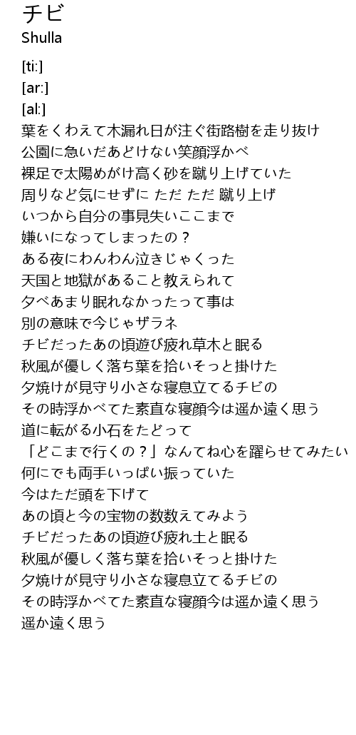 | [01:46.73] | チビだったあの頃遊び疲れ草木と眠る |