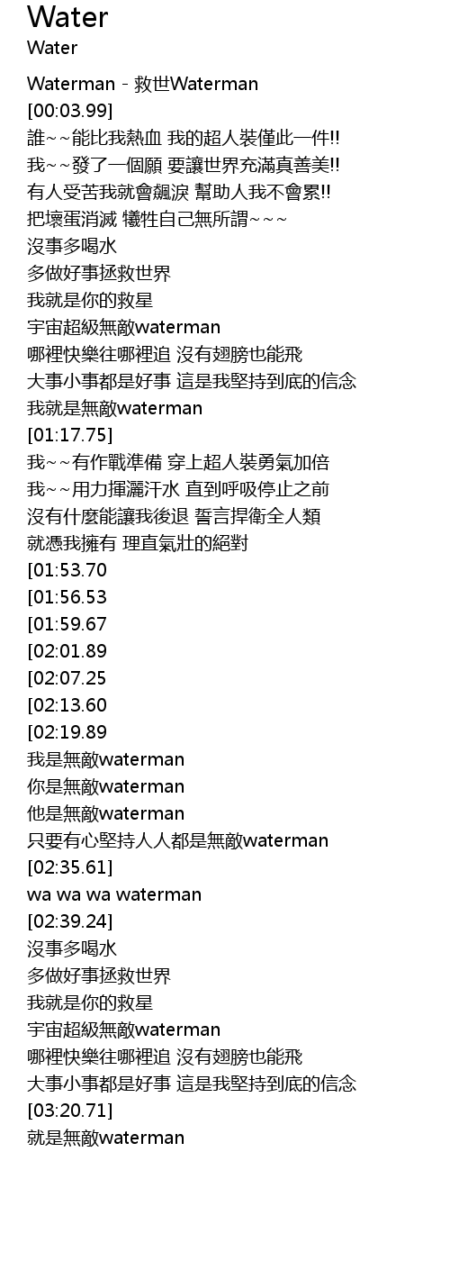 | [03:02.80][02:01.89] | 宇宙超級無敵waterman |
