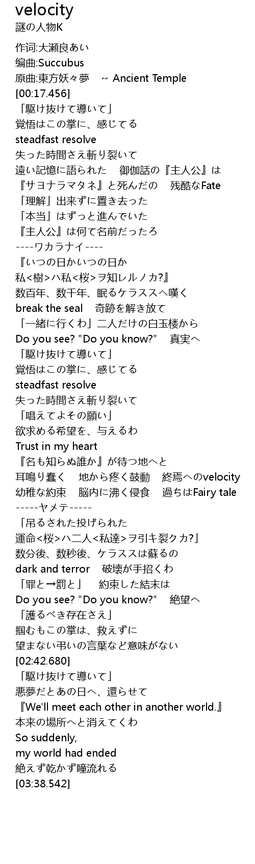 | [01:46.295] | 耳鳴り蠢く 地から疼く鼓動 終焉へのvelocity |