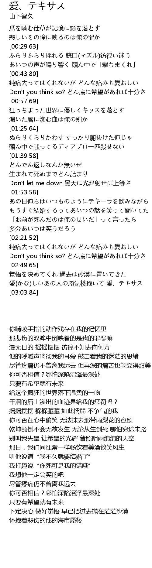 | [02:56.89] | 愛(かな)しいあの人の蜃気楼抱いて 愛、テキサス |