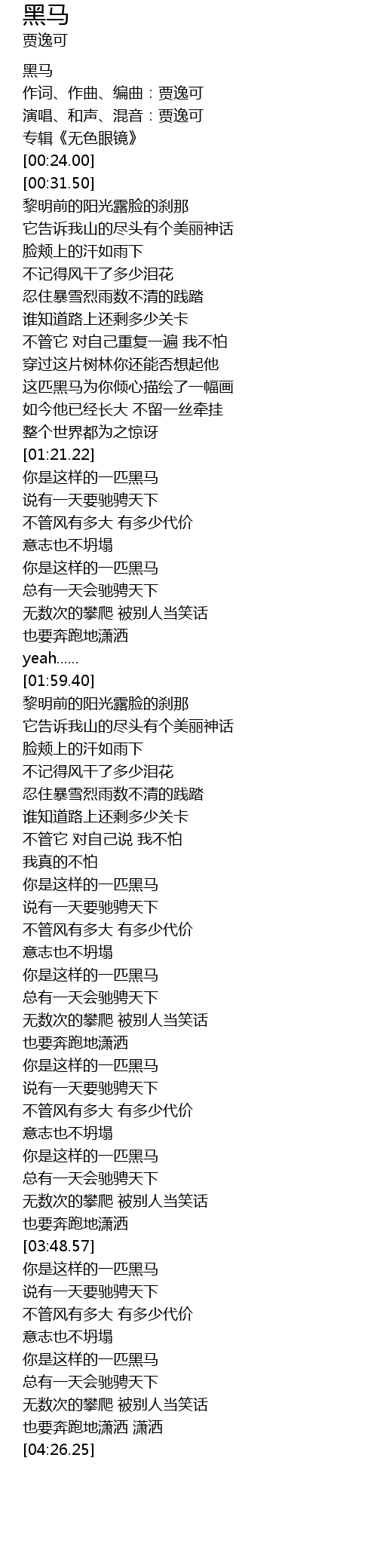 | [03:30.95] | nǐ shì zhè yàng de yī pǐ hēi mǎ |