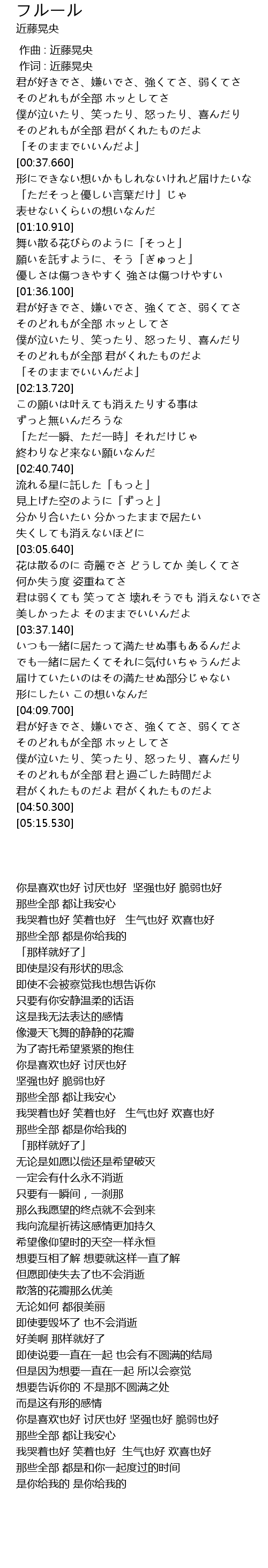 | [01:36.650] | 君が好きでさ、嫌いでさ、強くてさ、弱くてさ |
