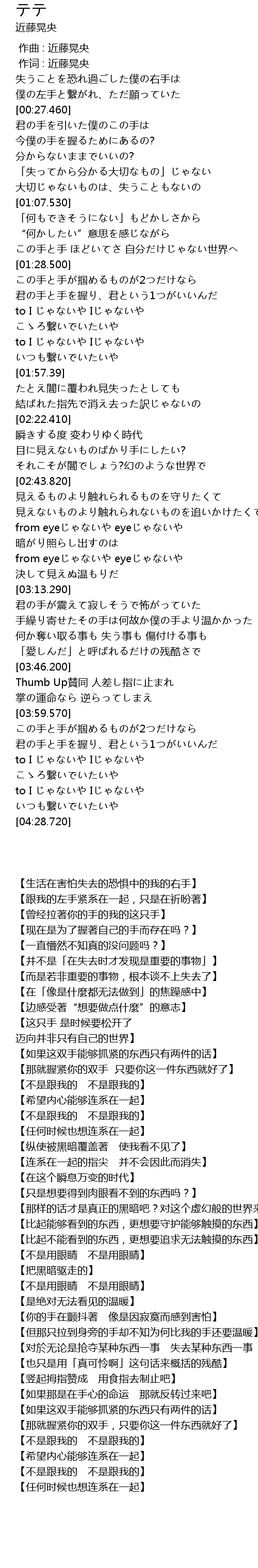 | [03:19.320] | 【你的手在颤抖著 像是因寂寞而感到害怕】 |