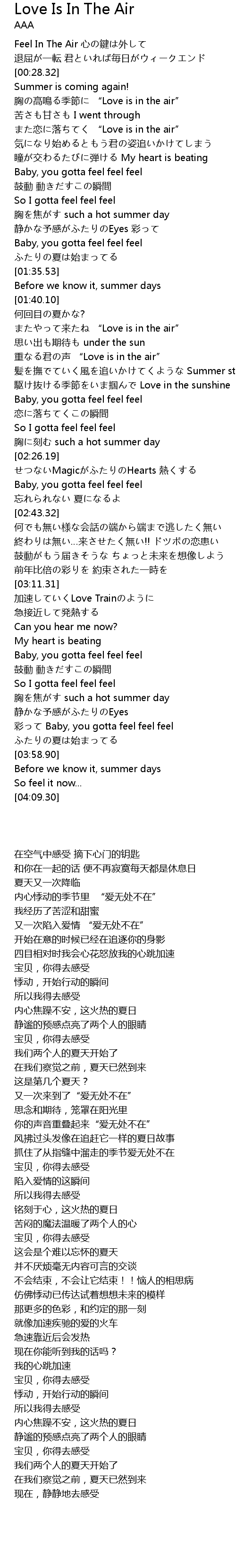 | [00:17.16] | Feel In The Air 心の鍵は外して |