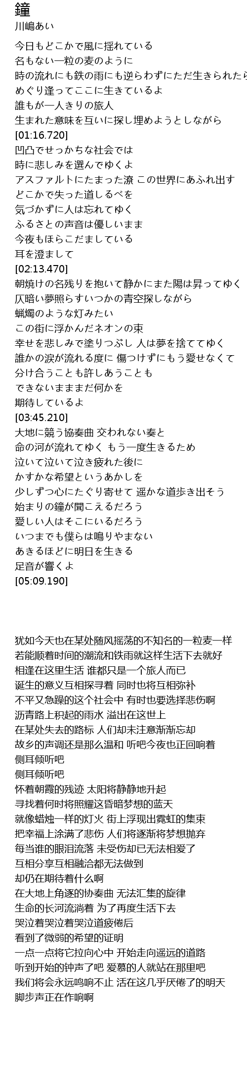| [01:56.400] | ふるさとの声音は優しいまま 今夜もほらこだましている |