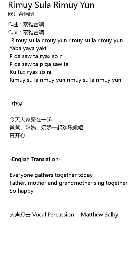 | 歌曲 | Rimuy Sula Rimuy Yun |
