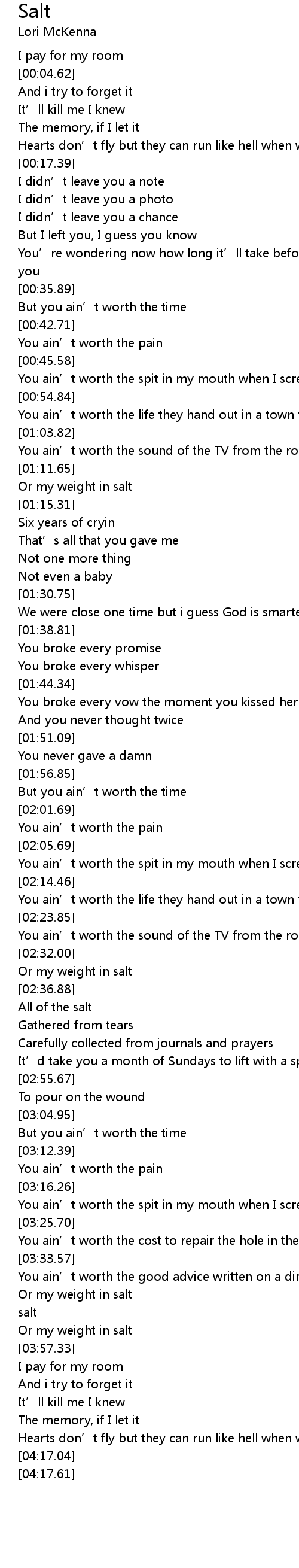 | [01:05.38] | You ain’t worth the sound of the TV from the room down the hall |