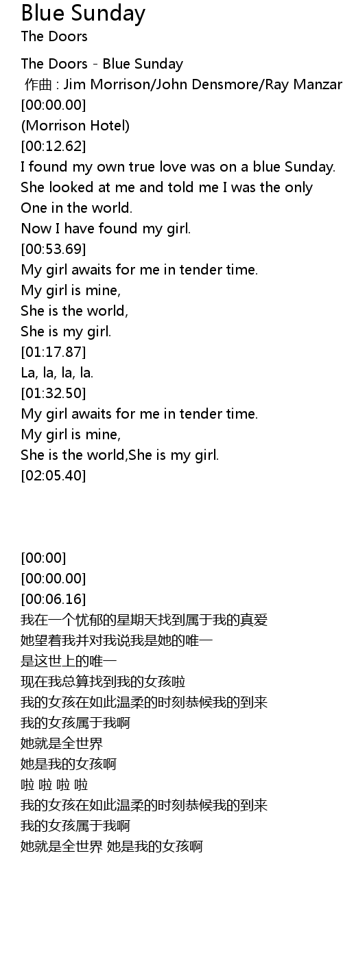| [00:18.93] | I found my own true love was on a blue Sunday. |