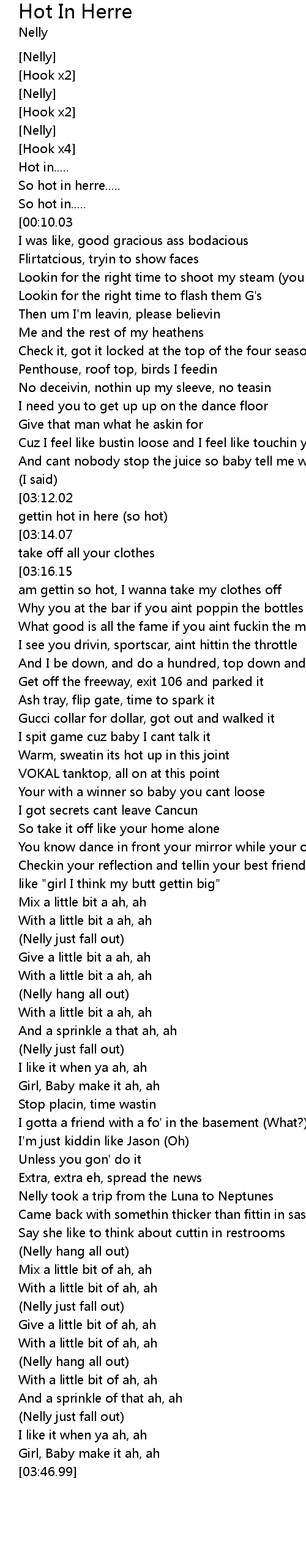| [03:20.77][03:12.02][03:02.77][02:54.05][02:08.96][01:59.99][01:14.96][01:05.97] | Its gettin hot in here (so hot) |