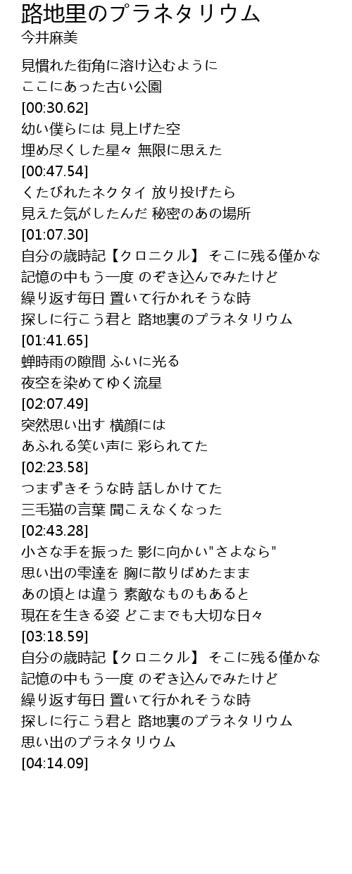 | [01:30.52] | 探しに行こう君と 路地裏のプラネタリウム |