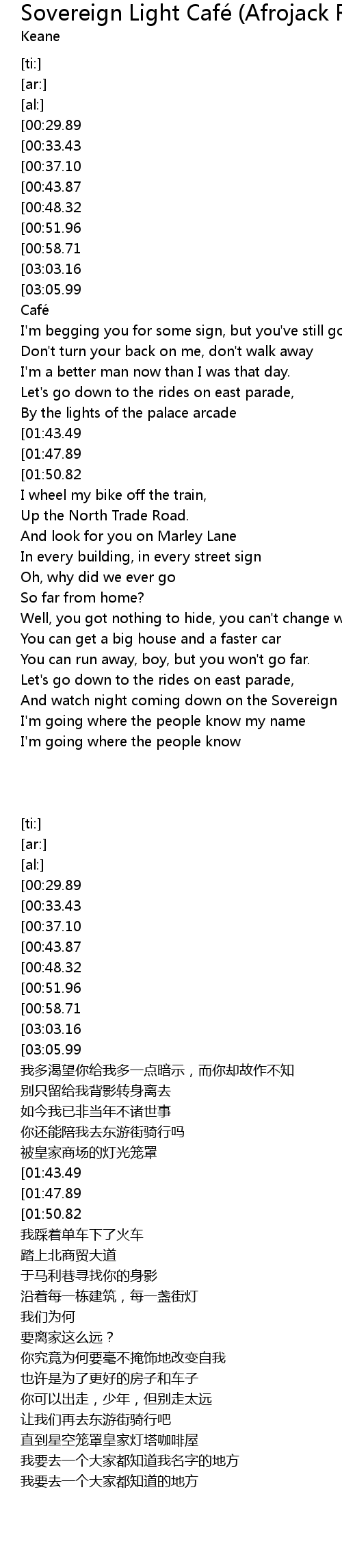 | [01:36.02][03:05.99][01:05.98] | And watch night coming down on the Sovereign Light Cafe |