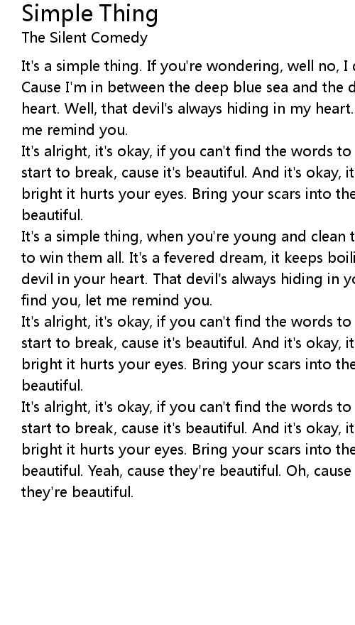 It's alright, it's okay, if you can't find the words to say. Let your voice start to break, cause it's beautiful. And it's okay, it's alright, if it's so bright it hurts your eyes. Bring your scars into the light, cause they're beautiful. |