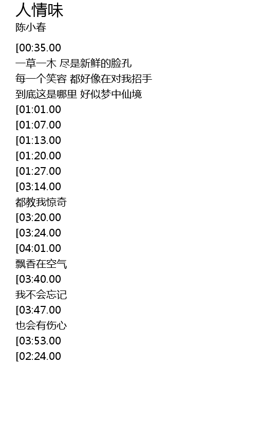| [04:27.00][04:01.00][03:34.00][01:54.00] | 熟悉的人情味 贴心的人情味 飘香在空气 |
