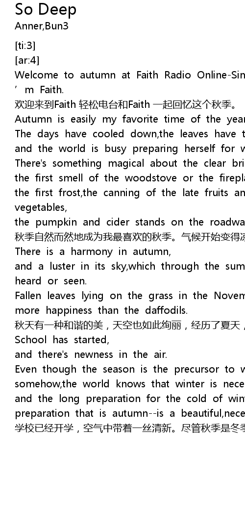 | [00:46.529] | Welcome to autumn at Faith Radio OnlineSimply to Relax, I ' m Faith. |