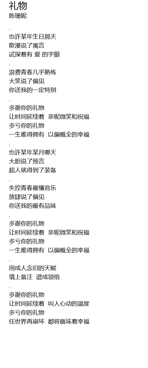| [02:06.98] | duō kuī nǐ de lǐ wù |