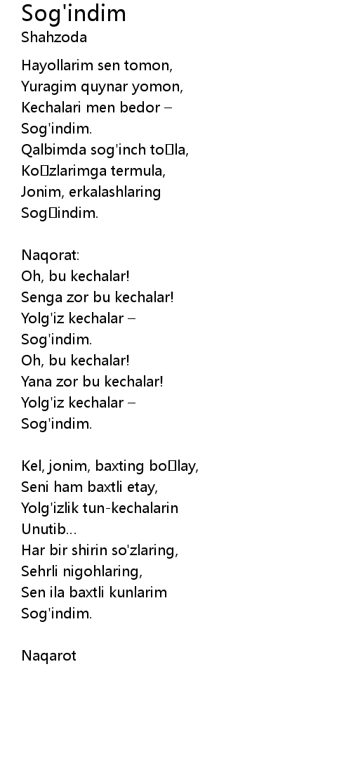 | 歌曲 | Sog'indim |