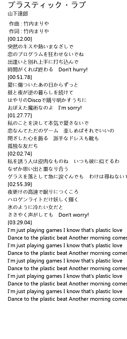 | [04:25.56] | I'm just playing games I know that's plastic love |