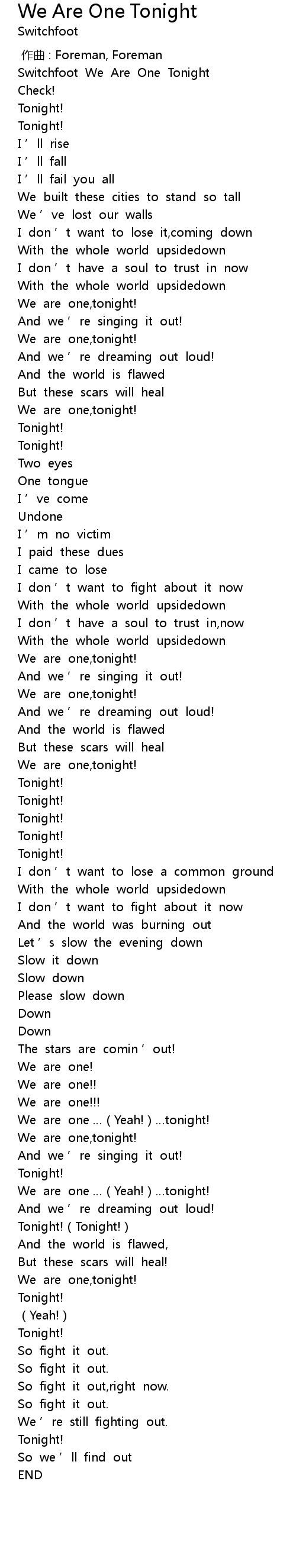 | [00:19.317] | Switchfoot We Are One Tonight |