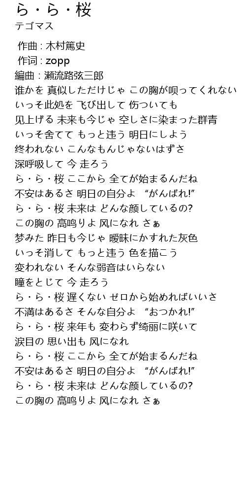 | [02:38.92] | ら・ら・桜 遅くない ゼロから始めればいいさ |