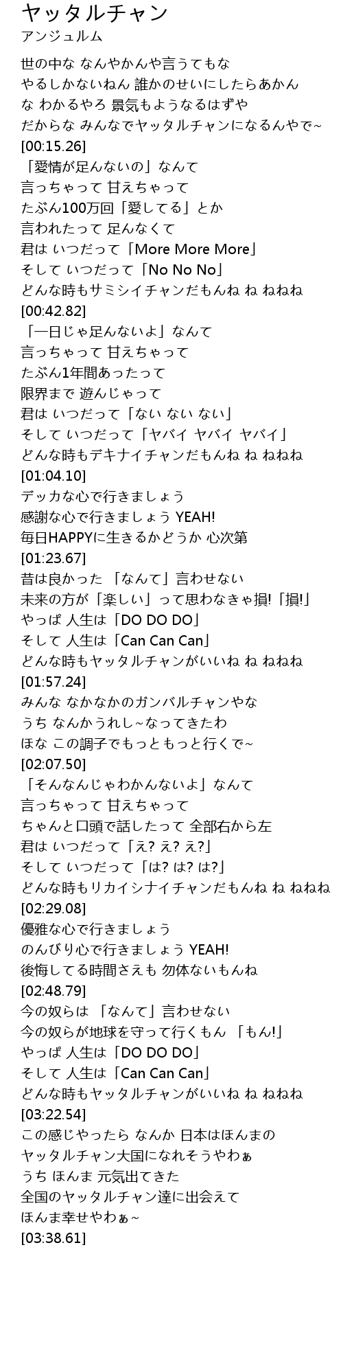 | [03:17.01] | どんな時もヤッタルチャンがいいね ね ねねね |