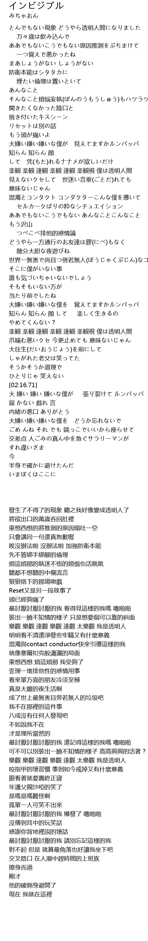 | [01:56.52] | 楽観 楽観 達観 楽観 達観 楽観視 僕は透明人間 |