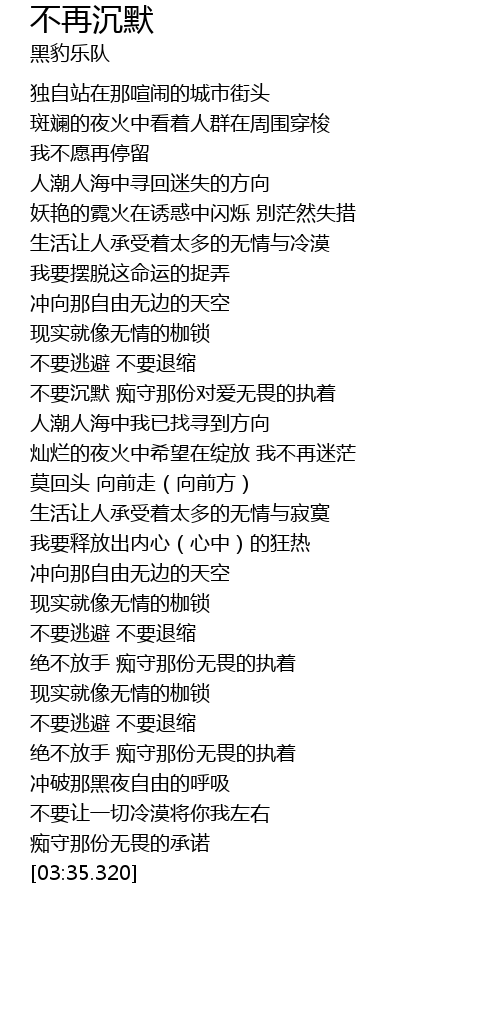 | [01:17.010] | 不要沉默 痴守那份对爱无畏的执着 |