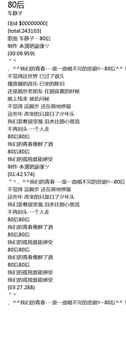 | [00:00.0] | 歌曲 车静子 - 80后 |