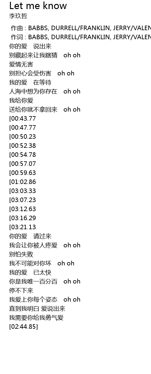 | [03:35.60][03:16.29][02:23.62][01:16.49] | let me know plz let me know |